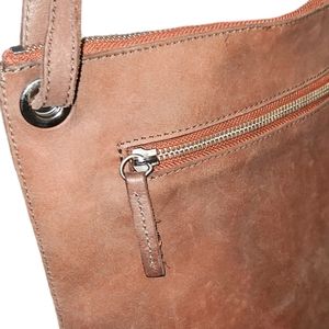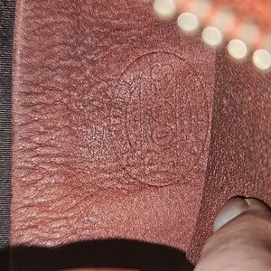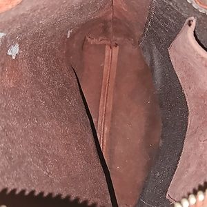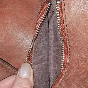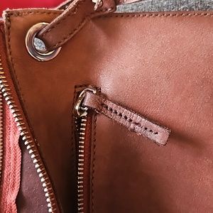 Soft leather, uneven a bit in color,oxblood and brown. Outside zippered pocket.