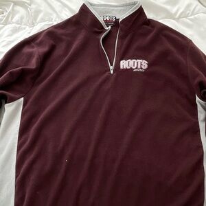 Cozy burgundy fleece pullover with a quarter zip neckline and embroidered Roots Athletics Logo. Relaxed, oversized fit makes it perfect for casual wear, lounging or layering over activewear