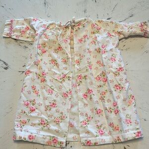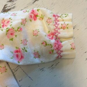 Vintage Rose flannel baby gown. Precious detailing at the chest and wrists. Newborn size. Would also be nice for a doll. Neck to hem length 13.5” shoulder to cuff 7.25”