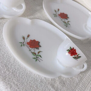 Vintage Rosecrest 8 Piece Snack Tea Set Dura White Floral Red Rose Federal Glass