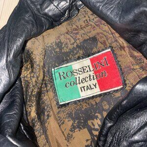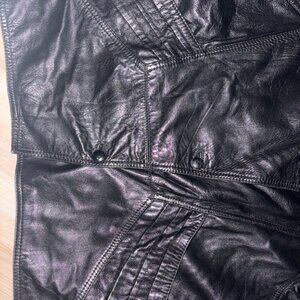 Beautiful soft leather, light shoulder pads, dolman sleeve, oversized frontal pockets at hips, chunky collar, lined, pleated details at shoulders, collar and pockets.