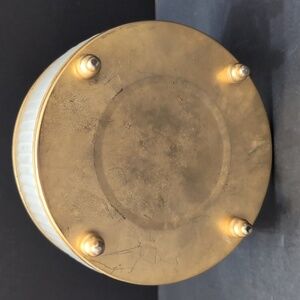 Beautiful vintage round beveled,etched frosted glass jewelry box from the 1970s,lidded and footed gold rimmed .