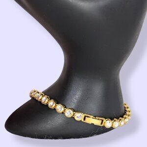 This vintage tennis bracelet is made of a gold tone metal and has a fold over clasp. The bracelet is made up of small round links, each with a white/clear rhinestone. The bracelet has normal wear, but nothing affecting wearability. There do not appear to be any missing or damaged rhinestones. I was not able to see any stamps or hallmarks.