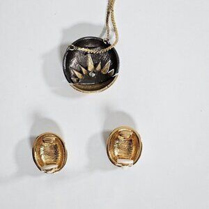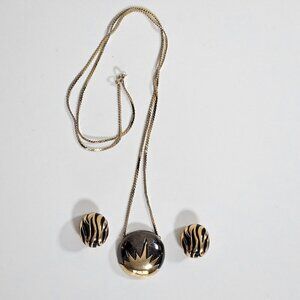 Color/pattern: earrings are gold and black, pattern simulates tiger's stripes; pendant is gold, black with pendant having something resembling maple leaf on a front.