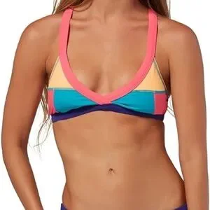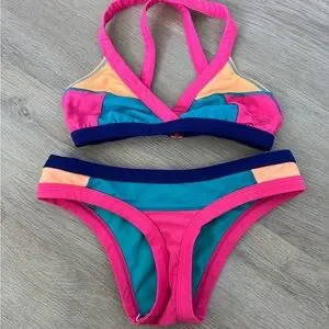Vibrant bikini set with adjustable top. Features pink, orange, and teal colors.