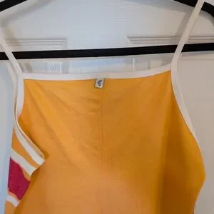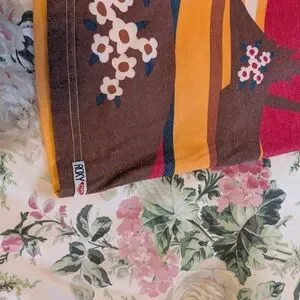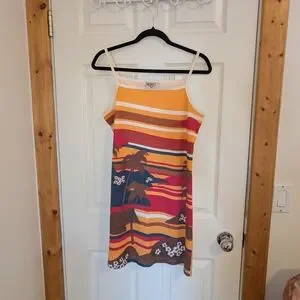 Vintage Roxy dress. Multicolor with tropical beach and striped pattern. orange, red, white, brown, blue. summer, surf, vibrant