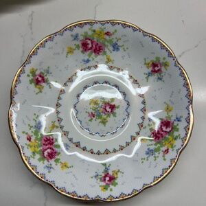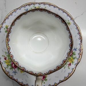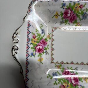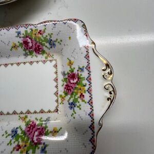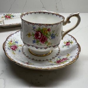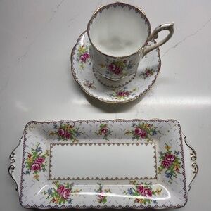 Beautiful, elegant bone china set that includes cup, saucer and sandwich tray in Royal Albert's Petit Point pattern. Lovely imitation cross stitch and gold trim accents. The tray measures 10 5/8ths inches x 4 7/8ths inches. No chips/cracks/crazing on any of the pieces. From a smoke free home.