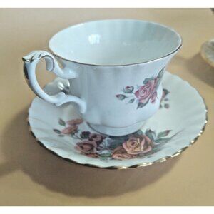 Royal Albert Centennial Rose pattern teacup and saucer feature large dusty pink roses in full summer bloom. Raised leaf detail on the handle. Trimmed in gold. Scalloped.