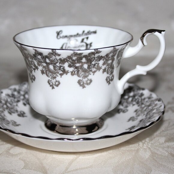 A perfect way to honor yours, or loved ones Silver Anniversary with this beautiful commemorative teacup set.