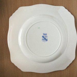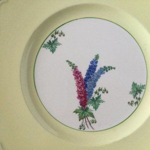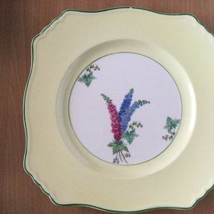 It is a vintage antique Royal Denby Staffordshire England Regd No 768985 Larkspur flowers yellow with green edge square shape scalloped plate.