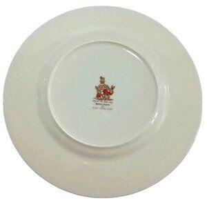 This small 8” diameter plate depicts a mailman collecting mail from a letterbox, with a Bunny running to give him a letter. Another mailman is riding a bird for mail delivery. The details are remarkable, with flowers and a little mouse.