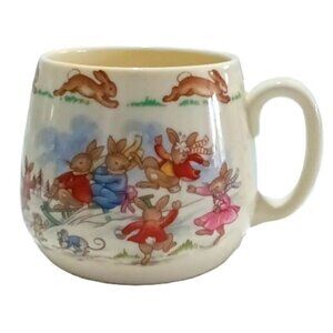 A beautiful Royal Doulton Bunnykins mug featuring rabbits playing in the snow. It has a hopping bunny border around the edge. Made in England from Fine Bone China.