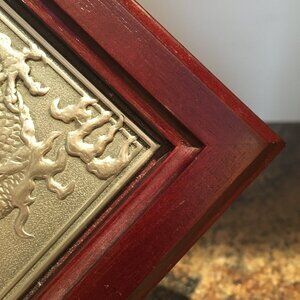 Very good preowned vintage condition art plaque featuring a Pewter Chinese Dragon artwork encased in dark reddish brown tropical hardwood. Almost looks like lacquer. This piece is one from a set of seven pewter plaques issued by Selangor Pewter in the 1980s. The Dragon symbolizes benevolence, wisdom and shrewdness. Measures approximately 5.5" by 5.5" with a .75" depth and includes beautifully integrated hardware for hanging.