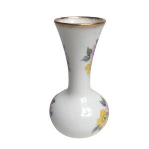 Very Pretty, Vintage 1960's, Royal Stuart Bone China Bud Vase White With Yellow and Purple Spring Flowers. Accented With Gold Trim. Made In England.
