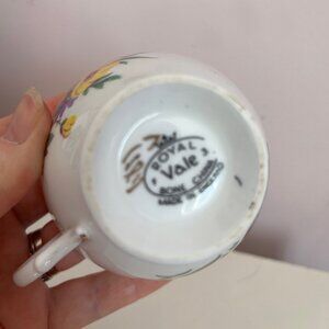 Pretty vintage teacup and saucer from Royal Vale. This teacup and saucer has a lovely floral pattern and gold rim. Excellent vintage condition.