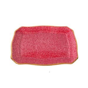 It has a dark mottled pink design on the front of the dish and exterior of the lid with gold trim.