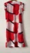Vintage. Ruby Lou. Black, red, white abstract print. Knee length. Translucent. Button details at shoulders. Button keyhole back. Includes matching belt. Good condition: some minor snags, see pics.