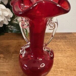 This stunning vintage ruby red art glass vase features a vibrant, hand-blown form with clear scroll-style handles and a gracefully ruffled rim. Its deep red hue and elegant silhouette give it timeless appeal, perfect for collectors or those looking to add a bold statement piece to their space.