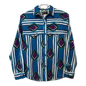 Vintage Ruddock Bros western style button down. Features a retro geometric pattern in vibrant shades of blue, teal, red and purple. Made from 100% cotton. No flaws to note. Tagged men’s size small, but please refer to measurements in photos, or listed below. Approximate flat lay measurements: