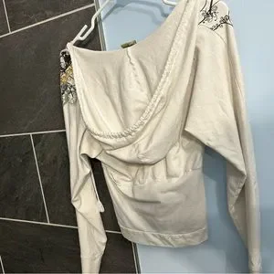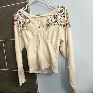 Size small Rufen boutique zip-up fitted sweater, the zipper is broken unfortunately but still works, could easily be replaced. This is a vintage piece you probably won’t find again, very 2000s aesthetic