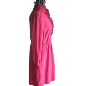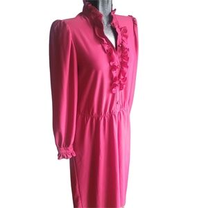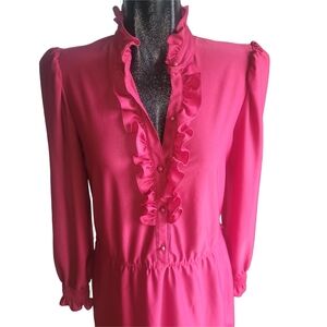 This elegant vintage red dress features charming ruffles and a flattering silhouette. Has a red pearl button neckline closure and a small elastic banded waist. Has belt loops, but does not come with a belt. Dress does not have any tags.