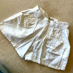 Step into effortless summer style with these vintage high-waisted white cotton shorts by Runaway Bay. Likely from the 1990s to early 2000s, they feature roomy pleated legs, front scoop & back patch pockets, belt loops & a silver logo button with zip fly.
