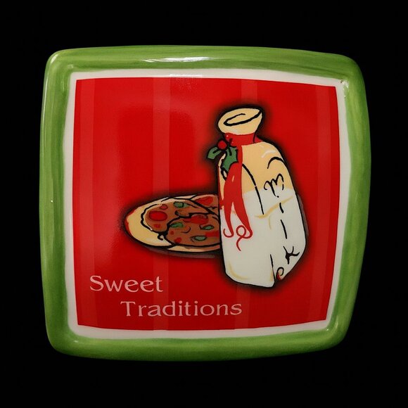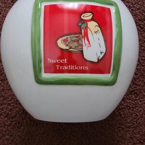 This Russ Berrie ceramic cookie jar is painted with the “Sweet Traditions” design and features a plate of cookies alongside a bottle of milk. The model number 22164 is clearly listed on the piece. The removable lid is green with a red handle, and includes a rubber seal to keep it snug.