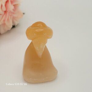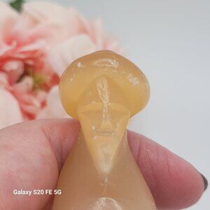This Vintage Russian Selenite Stone Carved Figurine is skilfully crafted. This sitting man figurine embodies the essence of Folk Art with its intricate carvings and warm yellow hue. Originating from the Russian Federation, it showcases the artisan's dedication to traditional techniques and the timeless beauty of stone.