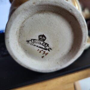 The Vintage SADLER 1539 Lustreware Ivory & Gold Striped Creamer is a charming piece of ceramic pottery originating from England. Hand-painted with a glossy finish, this creamer features a classic striped pattern in gold, adding a touch of elegance to any table setting. Produced in the United Kingdom using traditional pottery techniques, this item bears the Sadler brand and is a true vintage collectible. Standing at 3.5 inches tall, this creamer is a unique addition to any collection of decorative cookware and serveware.