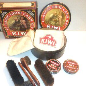 To pair it off there is a next to new water resistant & Leather Nourishing Norman Rockwell Commemorative Classic Shoe Care Kit with KIWI Brand Polish. One of the cloths has shoe polish stain on it.