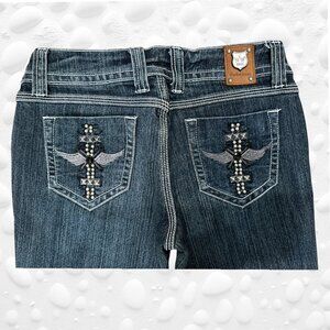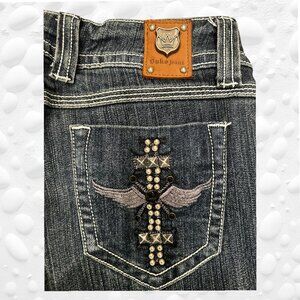 Step into style with these stunning vintage SUKO flared jeans. Featuring great hardware, beautiful beading, studs, and bling on the back pockets, these jeans are a true statement piece. Perfect for adding a touch of vintage charm and flair to any outfit.