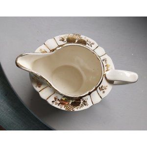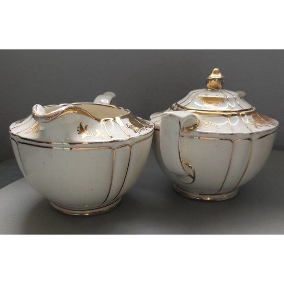 Vintage Sadler 1992 Mid Century Modern Style Aladdin Sugar Bowl with 2 handles and Creamer, Beige and Gold. Set in great condition for their age. The Gold is in great shape, there is some wear because they are previously owned and look like they were used and loved. There are no chips or cracks or repairs or crazing.