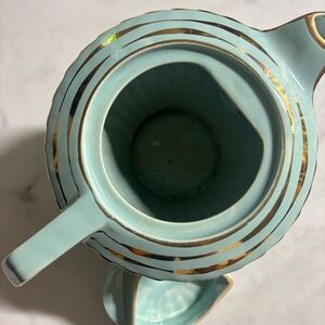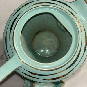 Vintage Sadler, England Art Deco ceramic teapot in mint green with gold accents. This is quite a striking piece from the 1940s with a stunning geometric based deco striped design. Note the interior strainer which dates this as pre-50s. This particular design is hard to find.