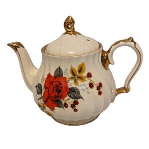 Vintage Sadler England Swirl Teapot White w Red Rose Classic Decor Kitchen