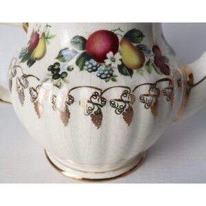 For your consideration is a large vintage fruit themed teapot made by Sadler, England in the 1940-1950s with a pretty design of luscious fruit with a gold overlay grape pattern, gold trim and the original Sadler sticker.