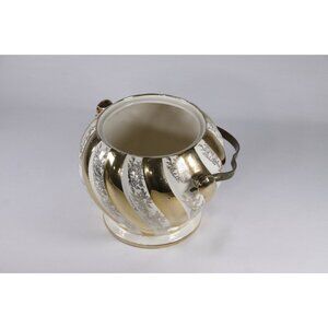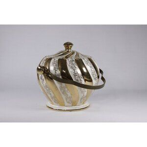A vintage gold and cream coloured lidded cookie jar by Sadler made in England, with Gold Swirl Bands, and Floral Filigree. The lid sadly broken and glued. When the biscuit barrel is in use, it´s not very noticeable or alternatively, the jar could be used without the lid. With a curved metal handle. The rest of the item with light crazing to the glaze, surface marks and rubbing to the gold patterned areas. Marked underneath "Sadler, made in England, EZ, -539y". This item dates ca 1937 - 1947.