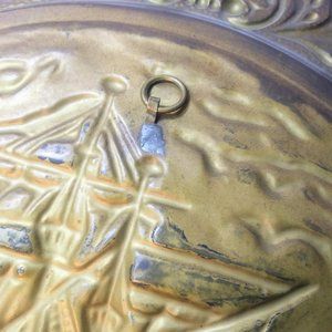 Very pretty pressed metal, embossed, decorative wall plate, plaque, with a nautical scene. It is gold with black accents, very shiny. We can see a big beautiful ship under the sun, with 2 other little ships. The rim has great details with leaves and flowers. It has a nice patina, consistent with age. There's a dent in the back (see pictures) almost not visible from the front. It is in great condition. Non smoker home.
