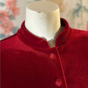 Elegant red velvet button down shirt. Features a mandarin collar and long sleeves. Perfect for a sophisticated look.