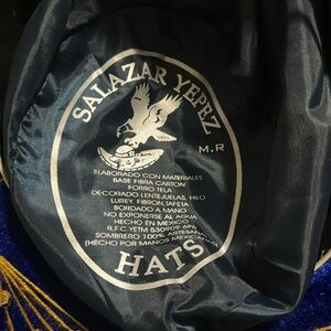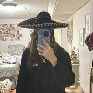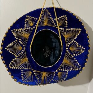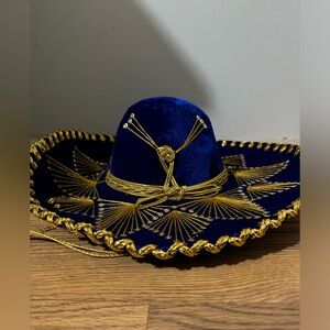 Has been sitting in my closet untouched never worn for years in perfect condition velvety blue fabric with gold detailing. Vintage Mexican sombrero bought in Mexico