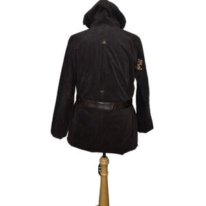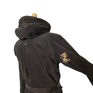 Stay warm and stylish with this vintage Salomon corduroy hooded jacket, perfect for winter sports or casual streetwear. Made with a soft yet durable black corduroy exterior, this coat features a full zip front with snap-button closures, a high collar, a belted waist, and an embroidered gold crest on the sleeve for a standout look.