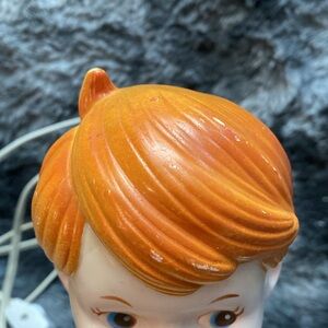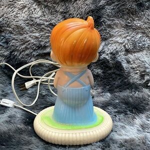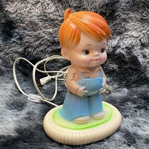 Very cute little lamp is by Sanitoy, NY NY. It's a rubbery plastic blow mold type lamp. It's a little boy with redish brown hair, blue eyes and he's wearing blue overalls