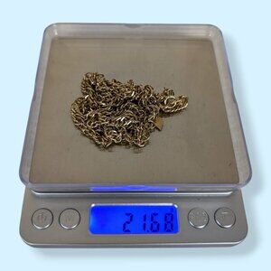 This vintage necklace by Sarah Cov is made of a gold tone metal and has a c clasp closure with a diamond shaped stamped maker's tag. The necklace is a long rope chain with somewhat flat links. This doesn't affect the rope chain aspect so much as it catches extra light and makes the necklace look crisp. There is some normal wear, but no issues affecting wearability.