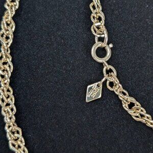 This vintage necklace by Sarah Cov is made of a gold tone metal and has a c clasp closure with a diamond shaped stamped maker's tag. The necklace is a long rope chain with somewhat flat links. This doesn't affect the rope chain aspect so much as it catches extra light and makes the necklace look crisp. There is some normal wear, but no issues affecting wearability.