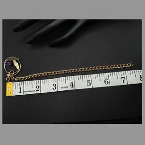 This lovely gold tone chain bracelet is made with the dangle! A single pendant hangs, amethyst cabochon surrounded by a delicate vine finishing with 2 layered leaves. Set in gold tone and in great shape, this gorgeous vintage piece will make a wonderful addition to your collection or a great gift!