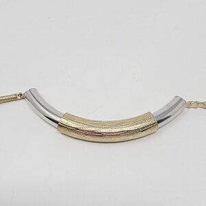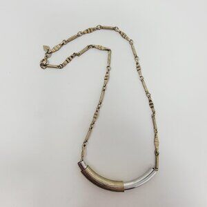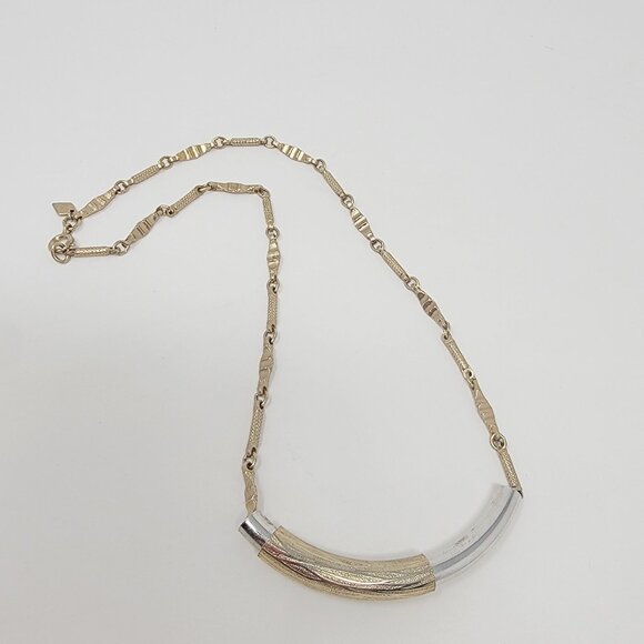 Beautiful vintage Sarah Coventry Canada necklace featuring a sleek curved bar pendant with mixed metal tones and textured detailing. The chain has unique patterned links, giving the piece an elegant mid-century look. Signed on the hang tag.