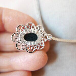 Design: Intricate silver-tone filigree surrounding a bold, smooth black center. The black element is a solid cabochon, which appears to be black glass or high-quality acrylic.