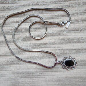 This is a beautiful, elegantly paired vintage necklace combining a signed Sarah Coventry pendant with a sleek, signed Monet chain. It's a striking black and silver-tone piece, perfect for a touch of timeless sophistication.