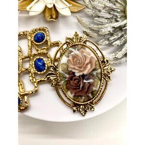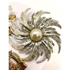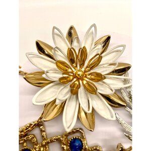 Add a touch of mid-century glamour to your wardrobe with this delightful set from Sarah Coventry. Featuring three standout brooches — a crisp white and gold enamel daisy, a silvery burst with a classic faux pearl, and a romantic rose cameo — this collection is full of charm and elegance. The gold-tone necklace with rich blue cabochons is pure 1960s sophistication. Whether you're dressing up a sweater set or adding flair to a pin-up look, these pieces are sure to turn heads.