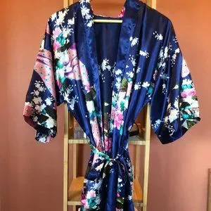 Slinky dressing gown with a beautiful peacock and floral pattern. No size indicated, but I imagine it could fit anywhere from an XS to a L.