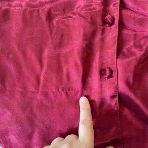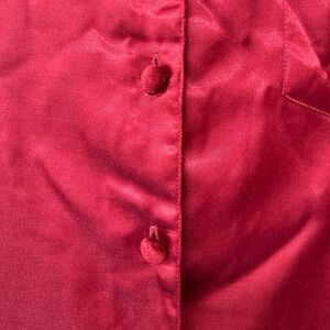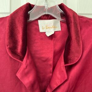 Elegant ruby vintage satin pajama shirt dress by Le Boudoir, featuring velvet trim detailing on the cuffs, collar, and chest pocket. This luxurious top has a beautiful luster and drape, with self-covered buttons and a relaxed, comfortable fit. Made from a smooth 83% polyester and 17% cotton blend, it’s perfect for lounging or elevating your sleepwear style.